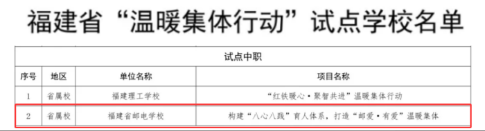 ½üÈÕ£¬¸£½¨Ê¡½ÌÓýÌüÕýʽ¹«²¼“ÎÂů¼¯ÌåÐж¯”ÊԵ㵥λÃûµ¥£¬¸£½¨Ê¡ÓʵçѧУ³É¹¦ÈëÑ¡£¬È«Ê¡½öÓÐÁ½ËùÖÐְѧУ»ñ´ËÊâÈÙ¡£Õâ±êÖ¾×ÅѧУÔÚ¼¯Ì彨Éè¡¢ÓýÈË»úÖÆ´´Ð·½Ãæ×ßÔÚȫʡǰÁС£