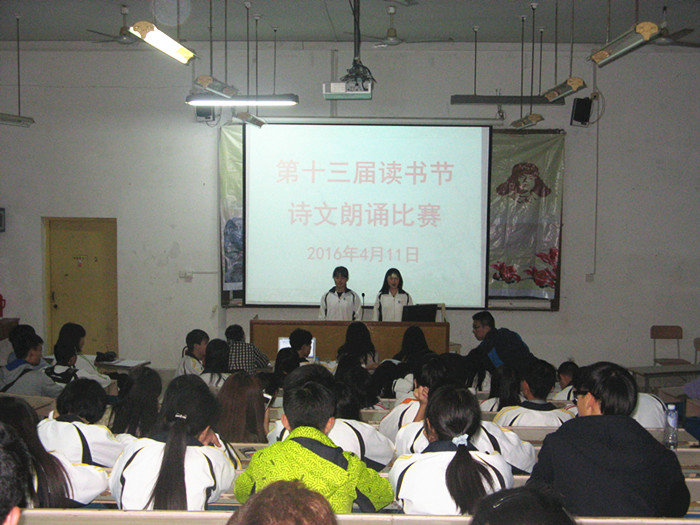 为提高同学们阅读经典诗文的兴趣,让同学们在朗诵过程中获得诗文经典的熏陶和感染,我校于4月11日和4月13晚自习在第三阶梯教室开展了第十三届读书节经典诗文朗诵比赛。