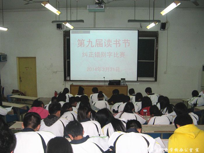- 3月31日,我校第九届读书节纠正错别字比赛在新图一阶举行。这次比赛由每班选派3名选手组成代表队,采用笔试闭卷答题的形式,每班3名参赛选手的总分即为本班级的团体比赛分数,然后以班级的团体比赛分数排列名次。来自各班级的81名选手参加了比赛,其中通信13五专1班和通信13五专2班代表队脱颖而出,获得并列第一名。