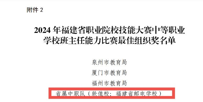 近日,2024年福建省职业院校技能大赛中等职业学校班主任能力比赛圆满落下帷幕。我校作为省属中职学校班主任能力比赛的轮值校,荣获“最佳组织奖”。此次获奖是对我校赛事承办和组织协调的充分肯定,也是对学校教育教学水平和管理能力的高度评价。